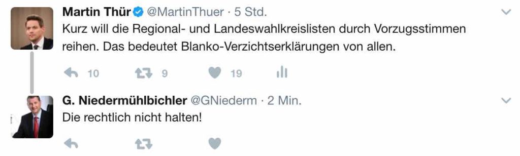 Auch alle, die auf einer SPÖ-Liste kandidieren wollen, müssen heuer wieder diese “rechtlich nicht haltbaren” Verzichtserklärungen unterzeichnen. Ein paar Minuten später hat es sich der SPÖ-Geschäftsführer anders überlegt und seinen Antwort-Tweet gelöscht. Noch nie in der Geschichte der Zweiten Republik wurde schon vor der Wahl so oft auf ein Mandat verzichtet wie vor dem Urnengang am 15. Oktober.