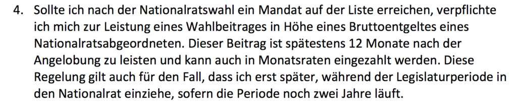Die ÖVP Tirol geht noch weiter. In einer ‘Verpflichtungserklärung’ bestätigen die KandidatInnen, sich an den Verhaltenskodex der ÖVP zu halten, nicht gegeneinander Wahlkampf zu machen und vor allem: ein Bruttogehalt eines Nationalratsabgeordneten bei gewonnener Wahl an die Partei abzuliefern.